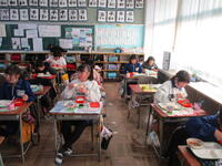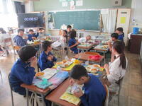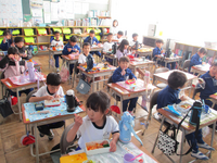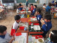 5年生の東っ子たちは、「給食おいしーです!」などと言いながら、今日もとてもおいしそうに給食を食べていました。