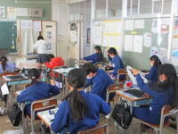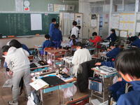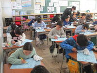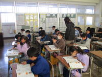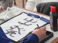 5年生の東っ子たちは、「 出発 」という字を筆を使って集中して書いていました。電子黒板には、書き方の手本が映像で流れていて、いつでも確認できるようになっていました。