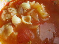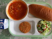 今日の真岡東小学校の給食は、焼きめんちカツ、シーザーサラダ、ミネストローネ、ミルクコッペパン、牛乳のメニューで、692Kcal(中学年)でした。