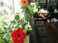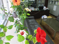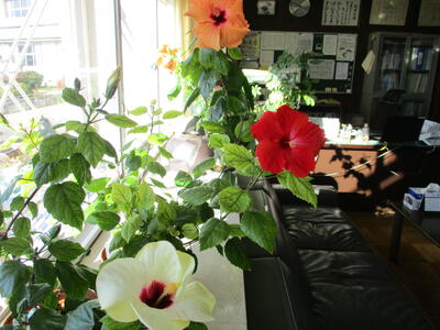 校長室には赤・白・黄色の3色のハイビスカスがあります。