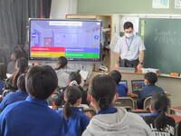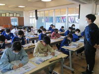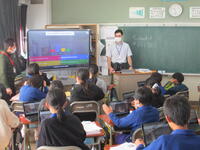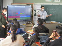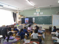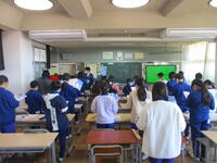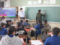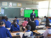 真岡市役所から2名の方に来校していただいて海外交流の様子を聞いたり、実際にオンラインで海外と結んで話を聞いたり、質問したりして交流しました。