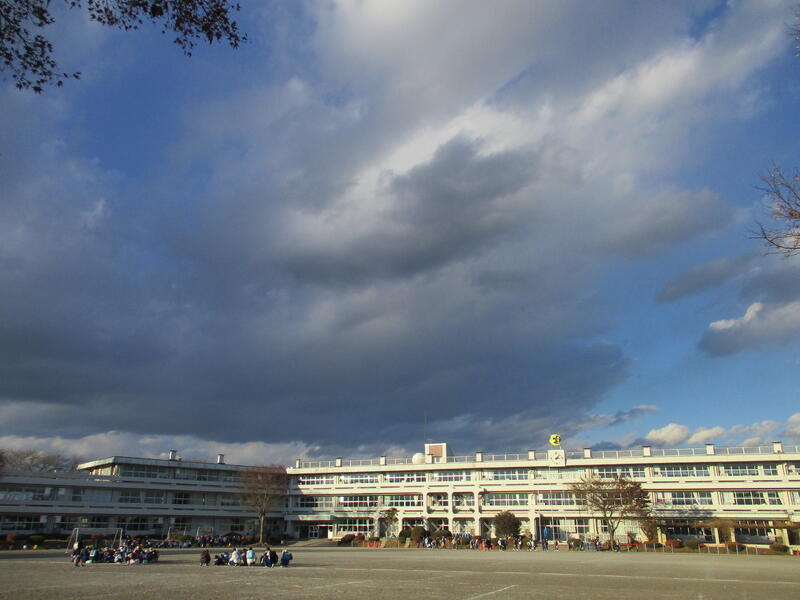 東っ子たちが下校するころ、真岡東小学校の校舎の上の西の空で、2機の飛行機がまるでクロスするように飛んでいました。2機の飛行機に気が付いた東っ子が「すごーい!」と空を指しながら声をあげていました。