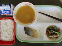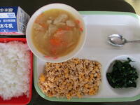 今日の真岡東小学校の給食は、「真岡西小学校リクエスト給食」で、とりのから揚げ、磯辺あえ、カレー、洋梨のタルト、ごはん、牛乳のメニューで、784Kcal(中学年)でした。
