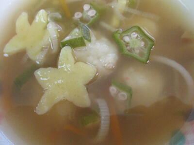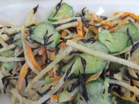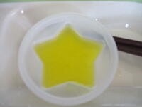 メニューは、星型のハンバーグバーベキューソースかけ、ひじきとごぼうのサラダ、七夕汁、お星さま三食ゼリー、ごはん、牛乳で、645Kcal(中学年)でした。