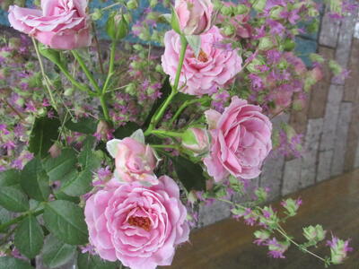 週明けの今日は、ガラスの花器に入ったアジサイと、薄いピンク色のバラの花が飾られています。