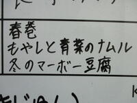 真岡東小学校の今日の給食は、春巻、もやしと青菜のナムル、冬のマーボー豆腐、ごはん、牛乳のメニューで、732Kcal(中学年)です。