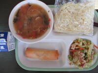 今日の真岡東小学校の給食は、春巻、中華サラダ、みそラーメンスープ、ラーメン、牛乳のメニューで、710Kcal(中学年)でした。
