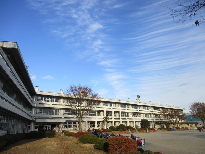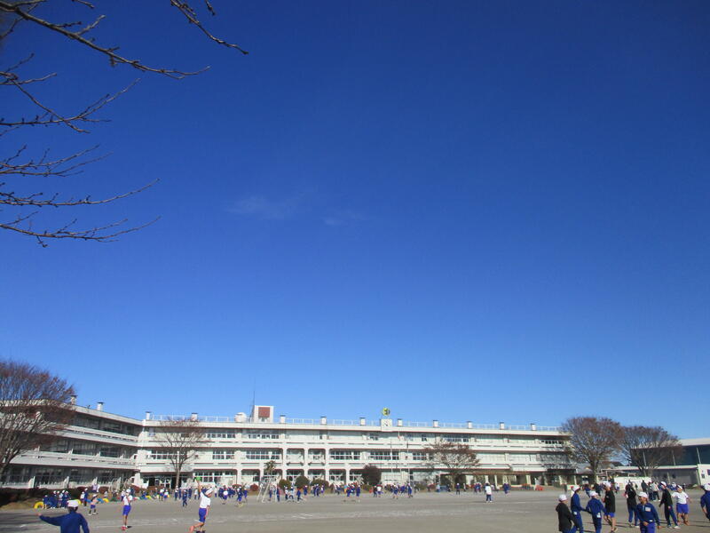 今日もいい天気できれいな青空の一日でした。真岡東小学校の校舎の上の青空に、まるで筆を使って描いたような流れる白い雲が浮かんでいました。