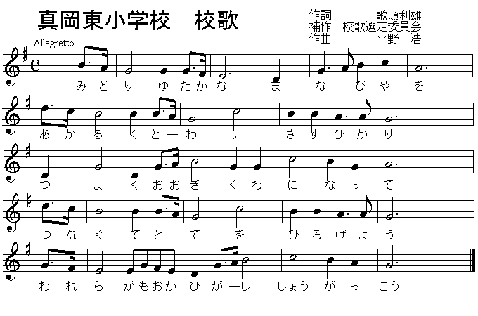 我 希 の 学 さ 我 澄 清 五 つ 我 つ 強 明 緑 真 ら 望 び び え ら ゆ く 行 く ら な く る 豊 岡 が に る の ず が く 正 の ば が ぐ 大 く か 東 真 燃 明 庭 る 空 し 水 の 手 き 永 な 小 岡 え 日 に 鳥 真 へ く に 峰 真 と く 遠 学 東 て の の 岡 を 岡 手 に 学 校 小 こ 東 胸 進 四 東 を わ 舎 校 学 は 知 だ 歌 小 は む 季 あ 小 に さ を 平 歌 歌 校 ば と ま 声 学 ろ 道 を お 学 ひ な す 野 頭 た 心 す は 校 う 見 ぎ 校 ろ っ 光 利 こ る る つ げ て 浩 雄 う つ よ う 作 作 曲 詞