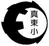 真東小(真岡東小学校)の文字をひらがなの「も」の字と「ひ」の字でかこんだ図になっています。 昭和56年1月9日校歌校章制定 |
