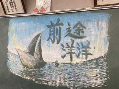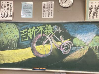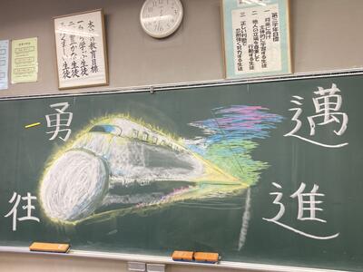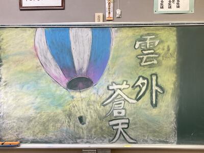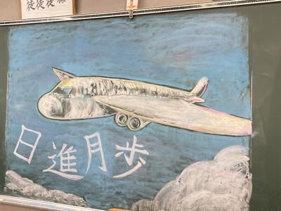 翌日、登校した三年生は、「旅」をテーマにした黒板アートを楽しみました。
