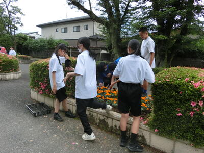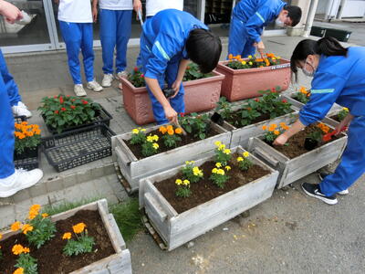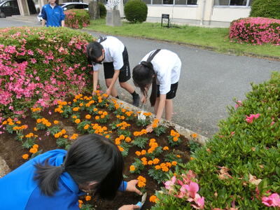 今日は「環境委員会」が、校内の植栽スペースに花を植える活動をしていました。