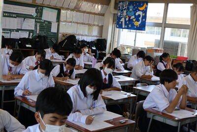 期日が決まり、1年生は先生から小学校や普段の単元テストとの違いや勉強のやり方の説明を受けました。(範囲が複数単元になるので勉強の計画を立てること、ワークブックに取り組むことなど)