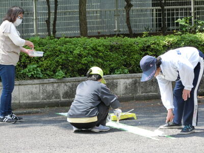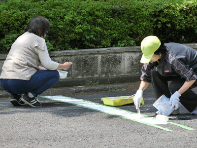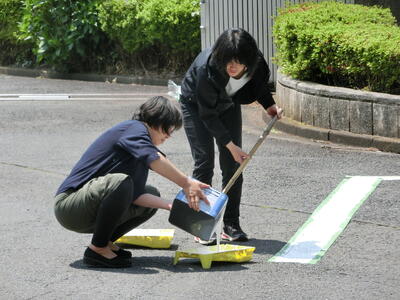 今日は駐車場の消えかかっていたラインを、校長や教頭、教務、用務員と補修してくださいました。
