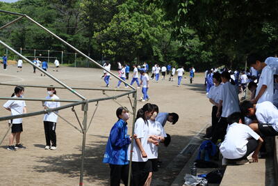 体育科の先生方が、今日の総練習に備えこのラッシュのような生徒の練習の間をぬって、ラインを引いたりアドバイスを送っています。