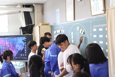 NHK for school『いじめをノックアウト「いじめが起きにくいくクラスって」』を教材として視聴し、いじめへの理解をはかり、各クラスそれぞれの方法で話し合いを進め、具体的な行動目標を決めました。
