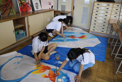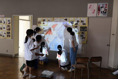 1,2年生が小さい1面を、他すべてを3年生が色彩や動きをつけながら彩色していきます。みんな絵具まみれです。