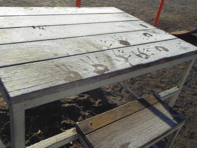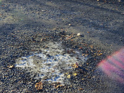 今日の朝は冷え込みが厳しかったです。駐車場の水たまりには氷が張り、朝礼台の上には霜が降りていました。