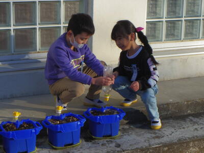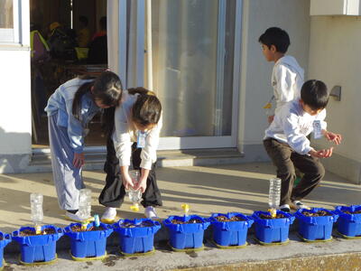 昇降口では、企画委員の児童が毎朝元気なあいさつをしながら、みんなを迎えています。1年生は、チューリップの球根を植えたので、毎朝観察したり水やりをしたりしています。