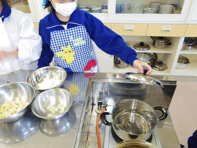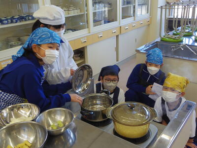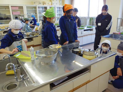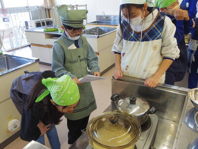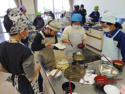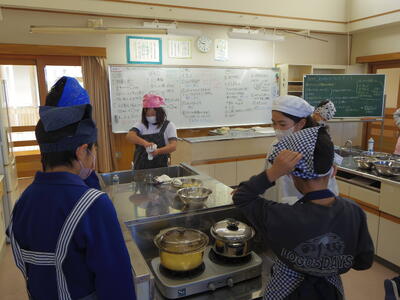 ごはんとお味噌汁づくりに挑戦です。グループのみんなで協力し合って、手際よく調理していました。