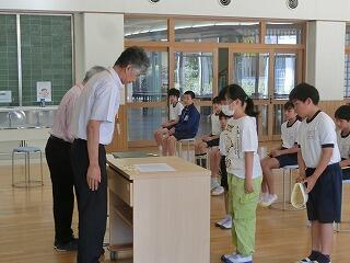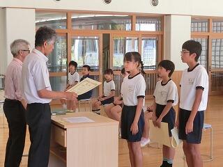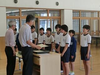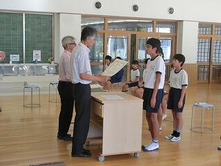 7月11日に7月の朝会がありました。まずは、バレーボール、陸上、歯と口の健康週間作品の表彰を行いました。