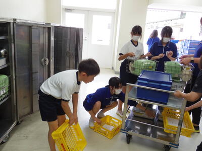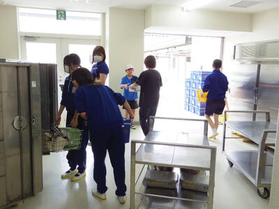 給食委員会 各教室から運ばれてきた食管を手際よく片付けています。いつもありがとう。