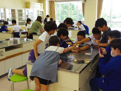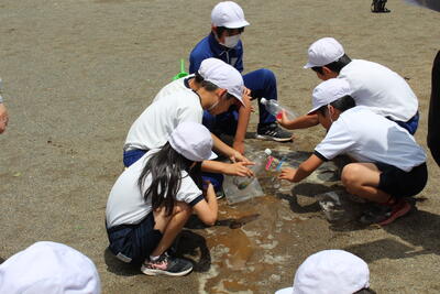 理科の「地面を流れる水のゆくえ」の授業風景です。「雨が降ってできた水たまりはどんなところにできるのか。」「雨が降った後に地面を流れる水の流れには、決まりがあるのか。」を調べる実験をしました。