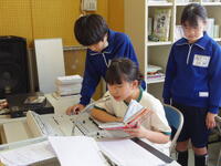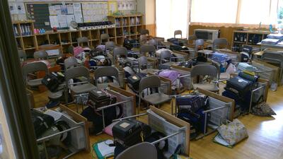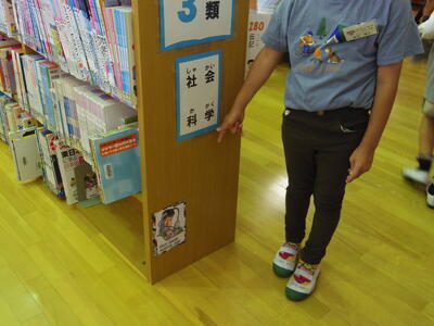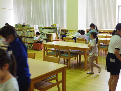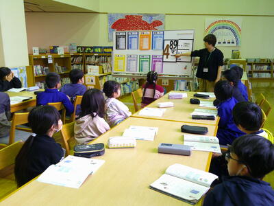 図書室オリエンテーションと避難訓練の様子です。図書室で自分が好きな本を探したり、教科の資料になるような本はどこにあるのか見つけたりする方法を教えてもらいました。避難訓練は、今回は竜巻を想定したもので、窓側に机を向け体を伏せて身を守りました。
