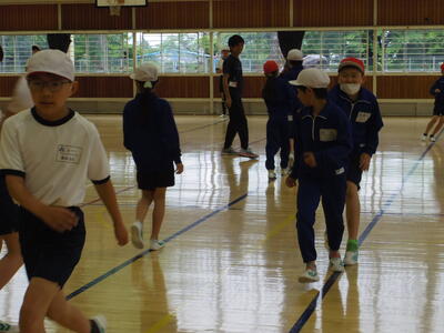体ほぐし運動 電車鬼・・・線の上を歩いている人をタッチするふやし鬼です。