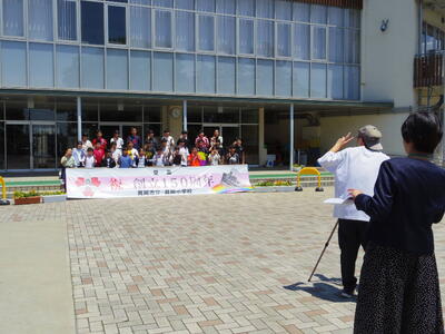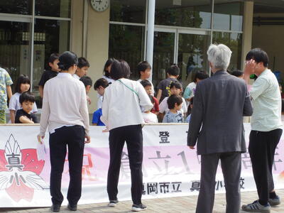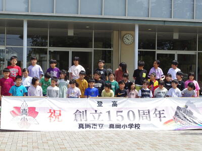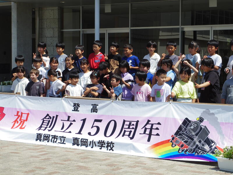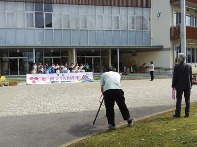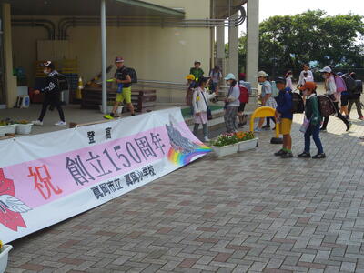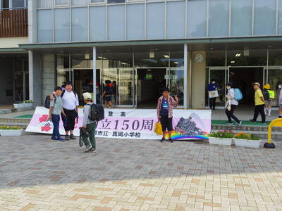 朝、昇降口前に飾られた150周年の横断幕を見て、子供たちはびっくり!