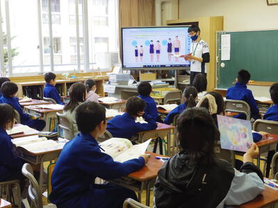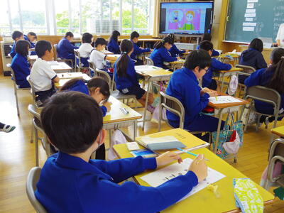 5年生:外国語 動画を見ながら、話していることを聞き取っています。