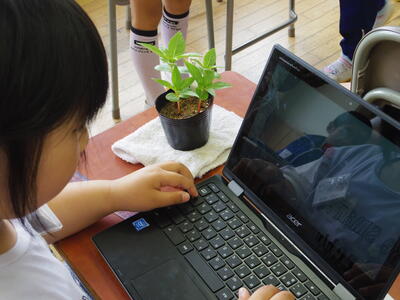 3年生:理科 ホウセンカの観察 観察して分かったことをタブレットを使って記録に残します。