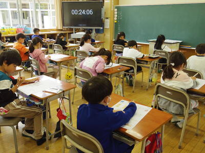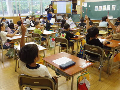 2組 「赤鉛筆を用意して。」の先生の声に、元気よく手を上げ、丸付け準備オッケー