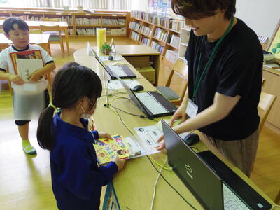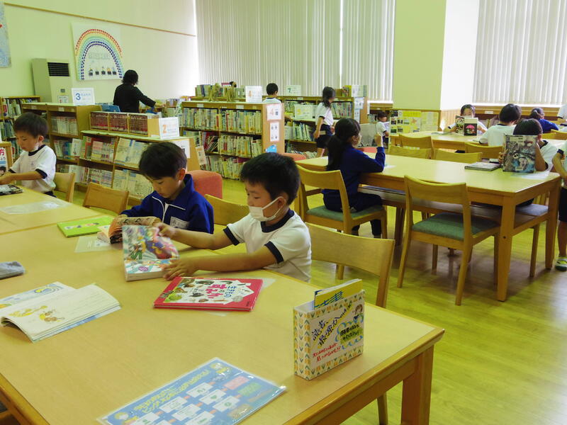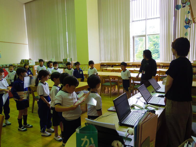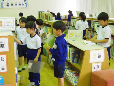 1組 図書室へ 本を借りに行きました。どんな本を借りようかな?