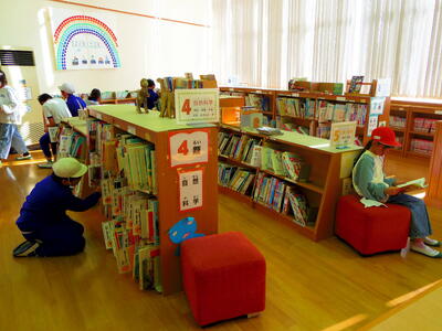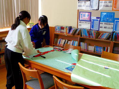 図書室では… 読書週間に向けて図書委員の児童が準備中です。