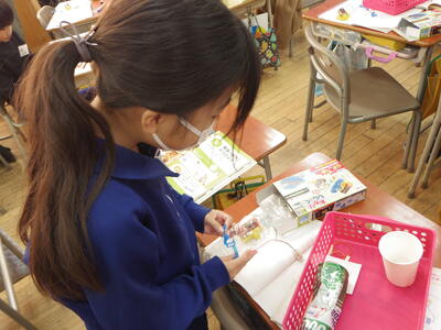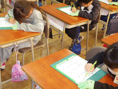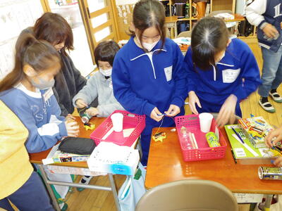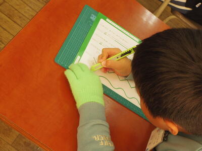 カッターナイフで窓を開けながら思いついたことを表す活動です。授業では、カッターナイフを使って、いろいろな線を切る練習をしていました。利き手でない手には軍手をはめて、安全対策ばっちりです。この後、窓の形や開け方を考えて、作品を作るそうです。楽しみですね。
