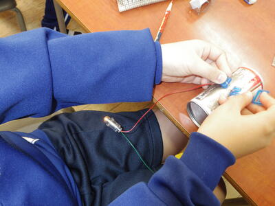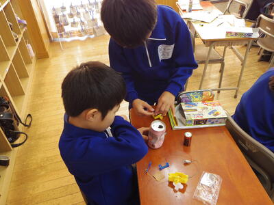 今日の授業では、電気を通すものと通さない物を調べていました。アルミ缶はつくかな?つかないかな?