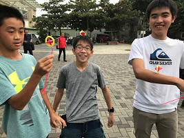屋台のくじで当たったおもちゃで遊ぶ3人。