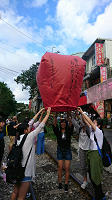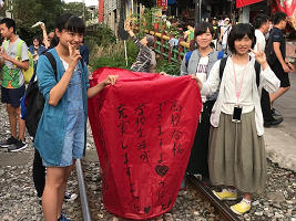 願い事をランタンに書いて、気球のように空に上げます。天燈上げ体験です。