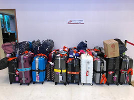 オレンジ色のバンダナが目印の、団員の荷物をターンテーブルから下ろしたり、バスに
