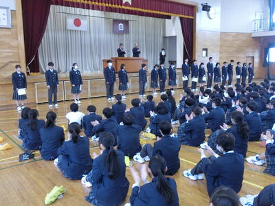 12月8日(月)、本日は「西の日」。保護者の方も見に来られ、次期生徒会長、生徒副会長を決める、生徒会選挙意見発表会並びに投票が行われました。生徒たちは、寒さが厳しくなっている朝にも挨拶運動を行い、応援弁士の生徒たちは給食の時間に魅力を伝えるなど、全力で頑張ってきました。