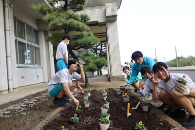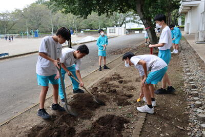10月7日(火)、全校生で「全校緑化活動」を実施しました。生徒たちは花壇の草刈りや花の植え替え、落ち葉掃きや石拾いなどに一生懸命取り組みました。活動を通して、自分たちの学校を大切にする姿勢や、仲間とともに進んで働く姿が多くみられました。これからもきれいな学校をみんなで守っていきたいと思います!