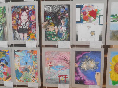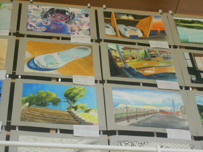 夏休みから構想・制作をはじめ、水彩絵の具やポスターカラー、クレヨン、色鉛筆、ゼンタングル(ペン)、コラージュ(折り紙)など、部員が使いたい画材・技法を自由に使って表現しています。