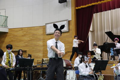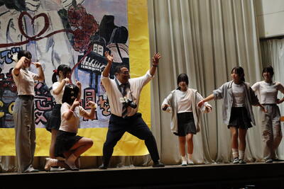 本校で働く、教職員をモチーフに様々な生き物のキャラクターたちがダンスや合奏をしている様子が描かれています。