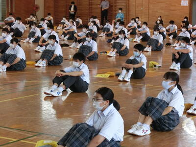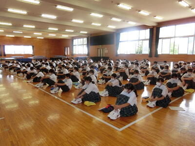 1・2年生のみのため、体育館にて行いました。(ソーシャルディスタンスをとっています)