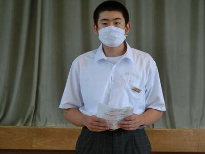 4日(木)、多くの保護者に見守られる中、2年生131名が「立志」を迎えました。今年は感染症対策のため、1・3年生は教室からリモート視聴でした。