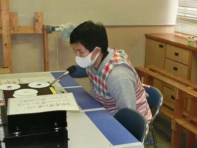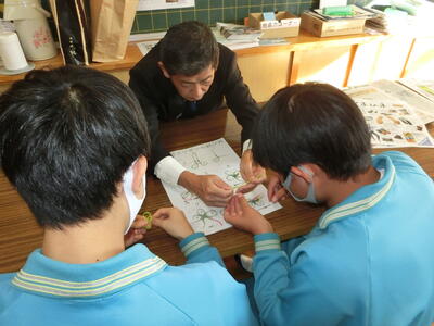 11日(水)、今日は3年生がシトラスリボン作りにトライしました。作り方を教わろうと職員室を訪ね、校長先生に教わる場面もありました。