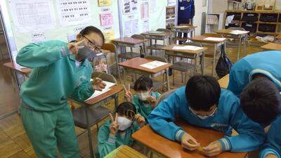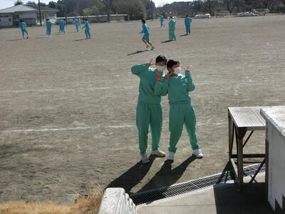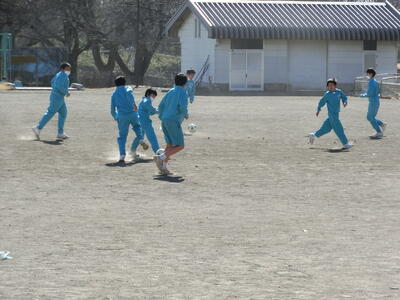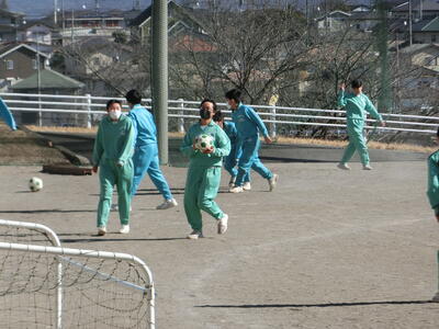 本県の緊急事態宣言が解除された8日、気温は低いものの春を思わせる晴天。西風が強く吹く中、昼休みには校庭で元気に活動する生徒の姿がたくさん見られました。