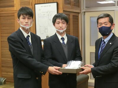 10日(火)、真岡工業高等学校生産機械科より「マウスシールド」が寄贈されました。学校まで届けに来てくれたのは、本校卒業生。先日のパーテーション同様、高校生による手作りです。