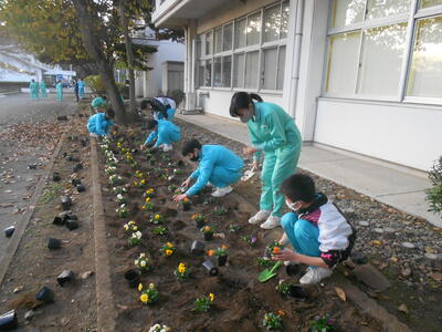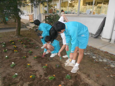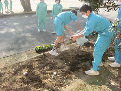 土を耕し、肥料を撒いています。明日、パンジーを植える前作業です。昼休みと放課後、熱心に行いました。